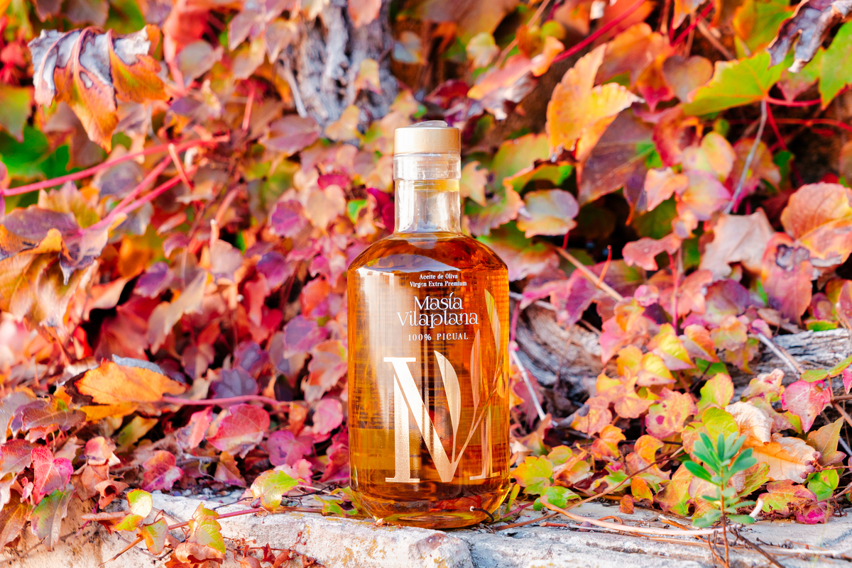 Masía Vilaplana se distingue por elaborar un AOVE monovarietal de la variedad picual, un aceite que refleja el carácter del paisaje mediterráneo donde se cultiva. Este AOVE destaca por su color verde con tonos amarillos, su perfil aromático frutado medio-alto y notas herbáceas y de frutos secos como manzana verde y almendra, características propias de los mejores aceites picual.
