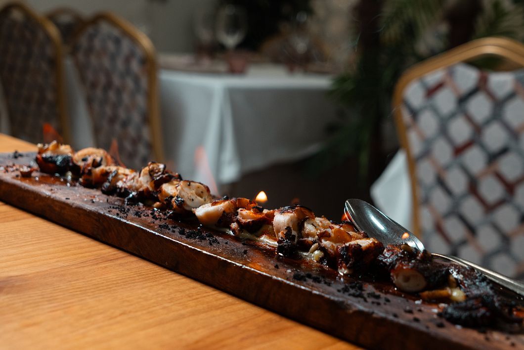 Sentados en el amplio y luminoso salón echamos una ojeada a la carta. Los entrantes son todos tentadores, pero nos decantamos por un surtido de hueva y mojama con almendras y un pulpo a la brasa de sarmiento acabado en llamas.