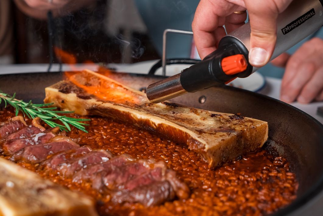 Así es: no solo por la espectacularidad del plato, su presentación o su preparación sobre la mesa, sino por la calidad de las viandas ofrecidas. Un tomate rosa de Altea trinchado con capellanes; una pata de pulpo a la brasa con patata asada; "Flor de alcachofa con jamón ibérico", cigalitas salteadas con ajos tiernos o torreznos de Soria con vinagreta de pistachos… todo esto por destacar algunos de los entrantes fríos y calientes para empezar a abrir boca.